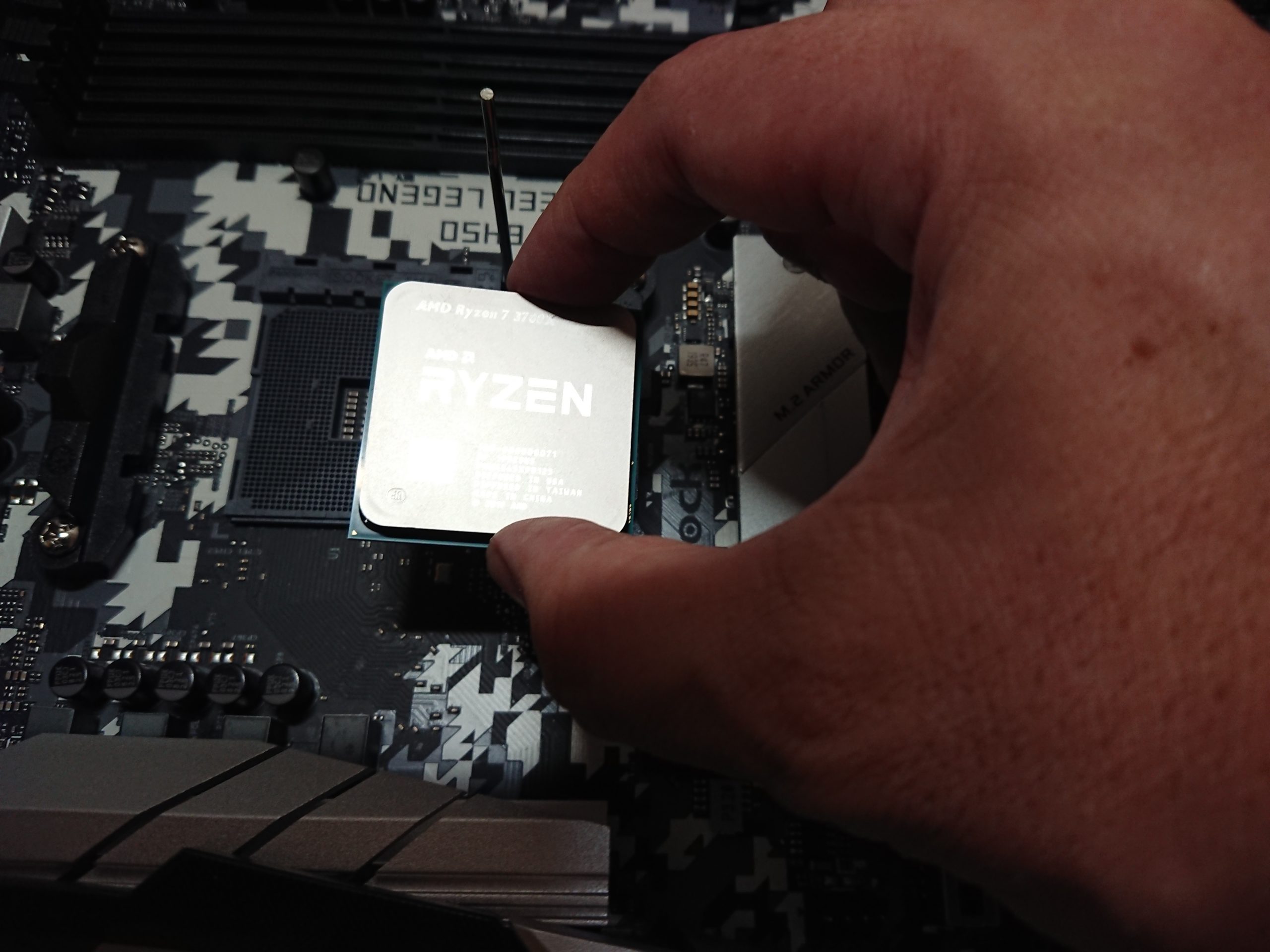 AMDのCPUの裏はピン形状ですので曲げないように細心の注意を払いながら作業してください。実は静電気防止手袋も同時購入していたのですがyoutuberの「吉田製作所」さんも「ともやし」さんも「手袋はするな、引っかかって余計危ない」と言ってありましたので素手で行きます。近くの金属をよく触って静電気を抑制しながら作業しました。冬は特に静電気には注意が必要です。