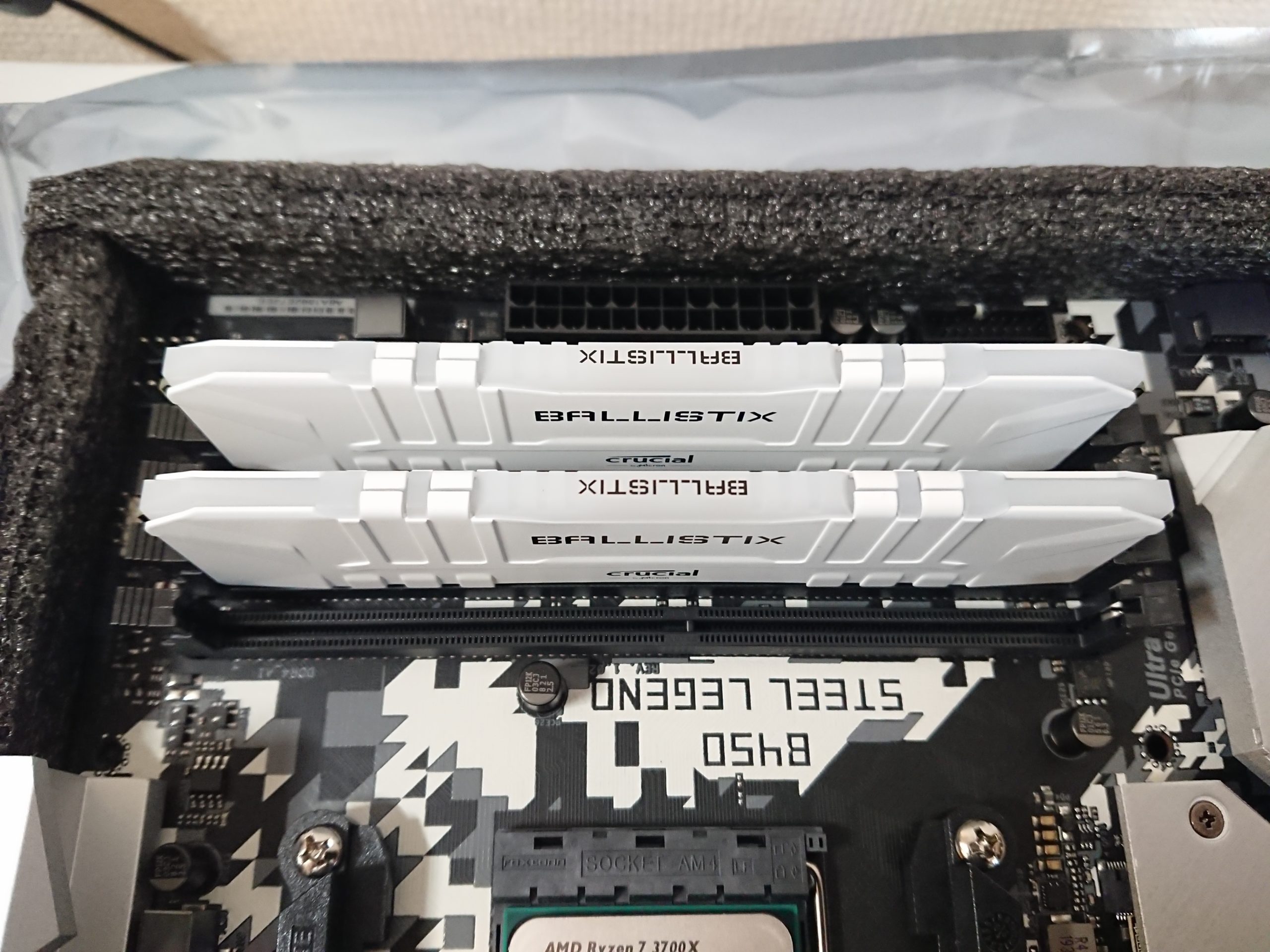 ラッチの反対側を先に入れてラッチ側を押せばスムーズに入りました。この後「マザボ割れるんじゃね?」レベルで両指で端っこを強く押し付けます。最初は怖いですが「カチッ」とか音は出ませんのでしっかり押し込みます。「メモリの差し込み不足で起動できない」は定番の自作あるあるですので「ぐっぐっ」と差し込みます。